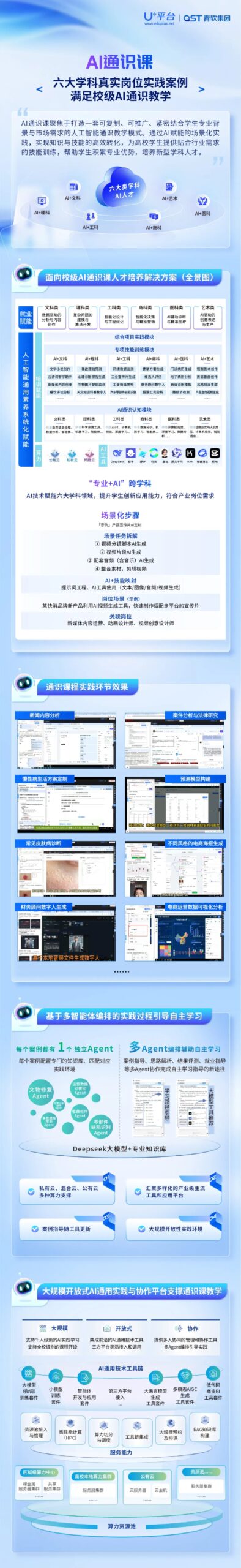 「该解决方案覆盖文科、理科、工科、医科、商科、艺术六大类专业,提供48个深度融合AI技术的场景化案例,通过专业技能训练与综合项目实践,助力学生实现跨学科融合创新。同时,方案创新引入智能体设计,能够为教师提供高效的教学编排工具,并有效激发学生自主学习能力。」青软集团数据智能产品部产品经理祁思瑶现场分享道。