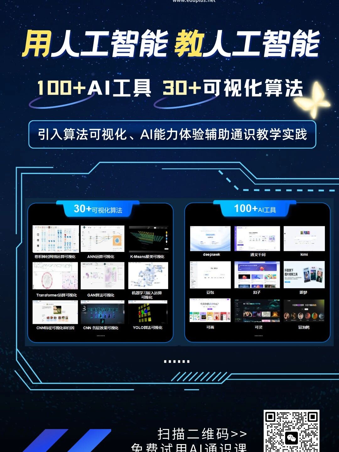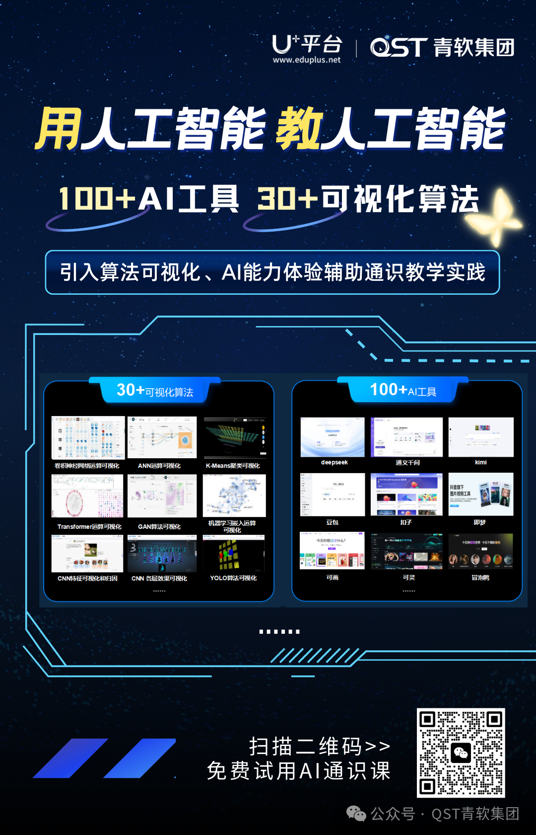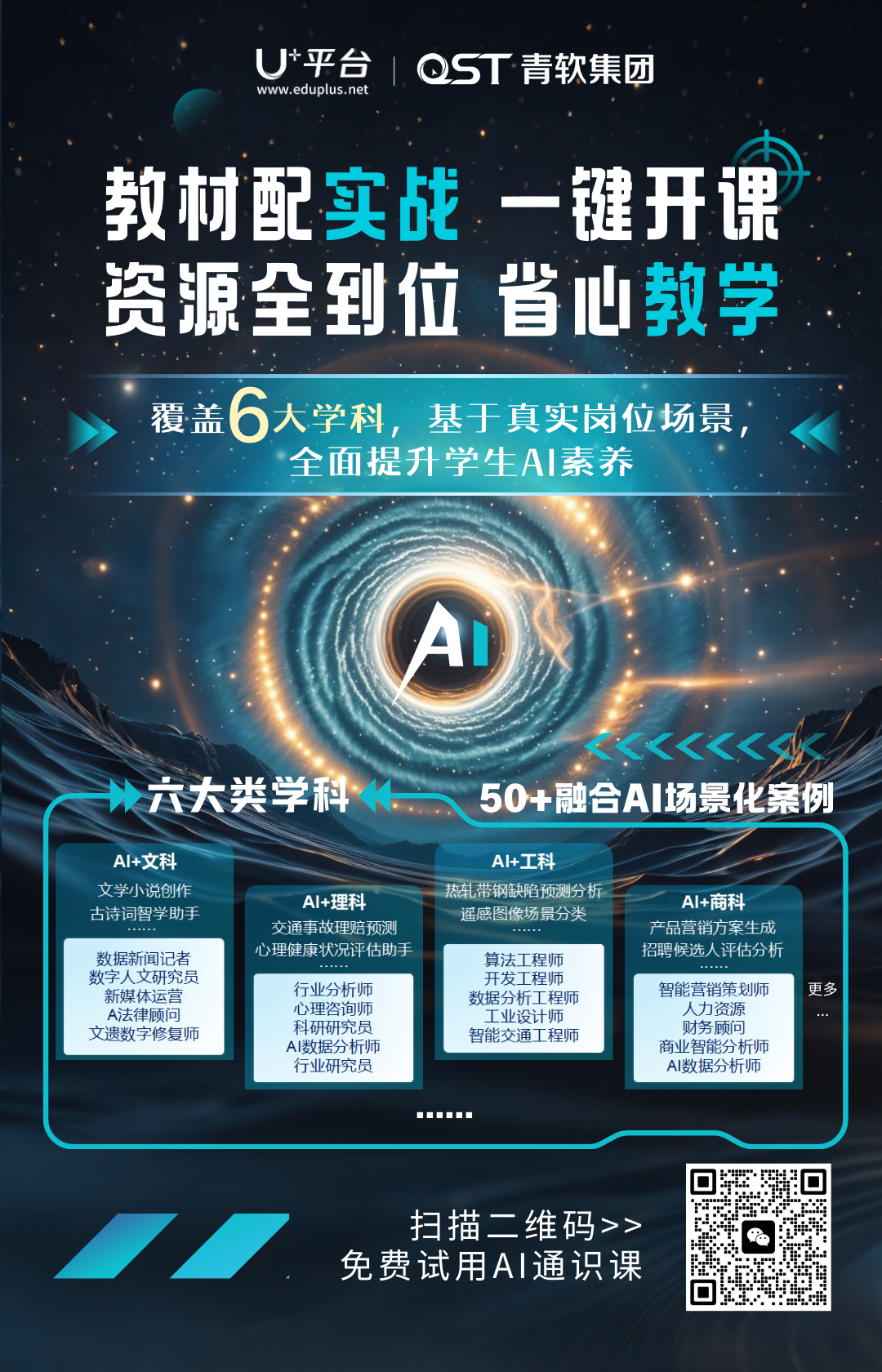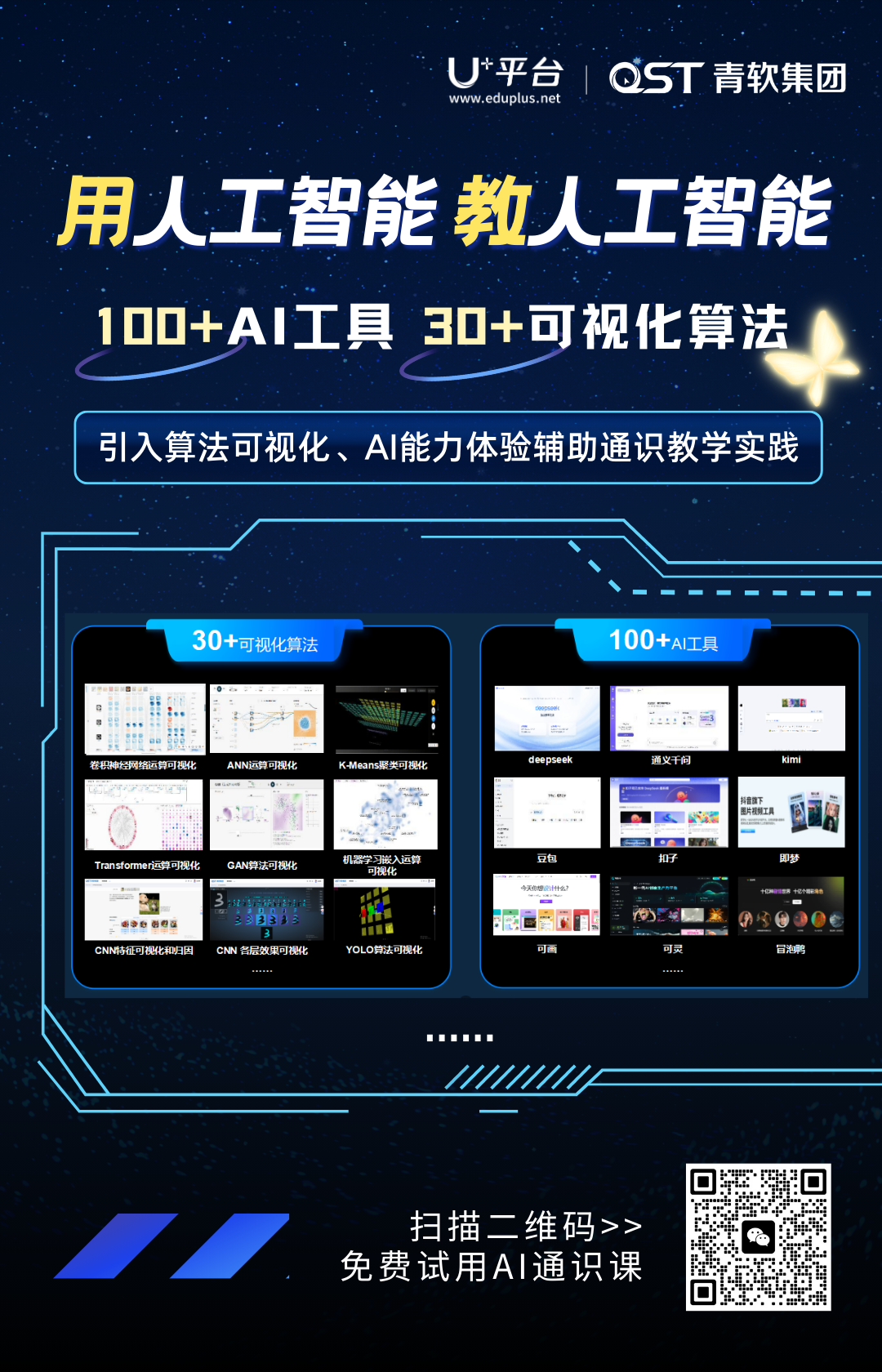 还在为AI通识课没工具、没案例、难落地发愁?青软集团特推出「AI通识课」来助力啦!<br><br>[得意]100+AI工具、30+可视化算法:卷积神经网络怎么「卷」?K-Means聚类咋分类?Transformer模型啥原理?全部可视化呈现,复杂算法秒变直观动画,课堂讲解瞬间「活」 起来!<br>[耶]6大学科、 50+真实场景:文科写小说、工科查缺陷、商科做营销…… 从 「文学创作助手」到 「智能交通工程师」,真实岗位案例直接搬上课堂,学生学完就能对接行业需求~<br><br>现在扫码免费试用!这个学期,带您变身「学生围着要课的宝藏老师」~