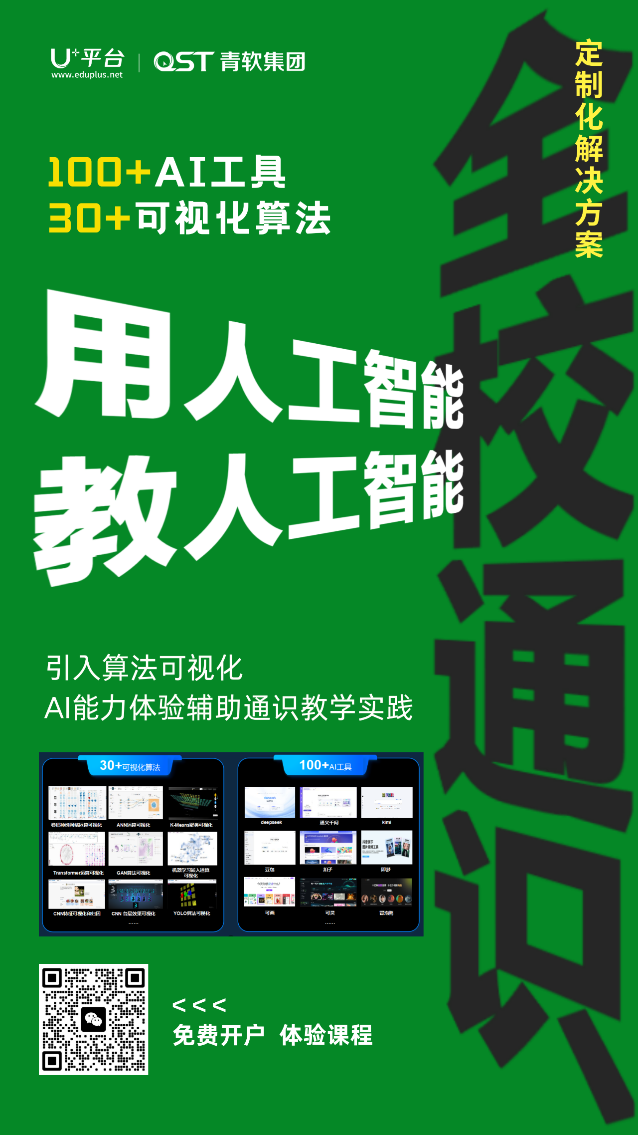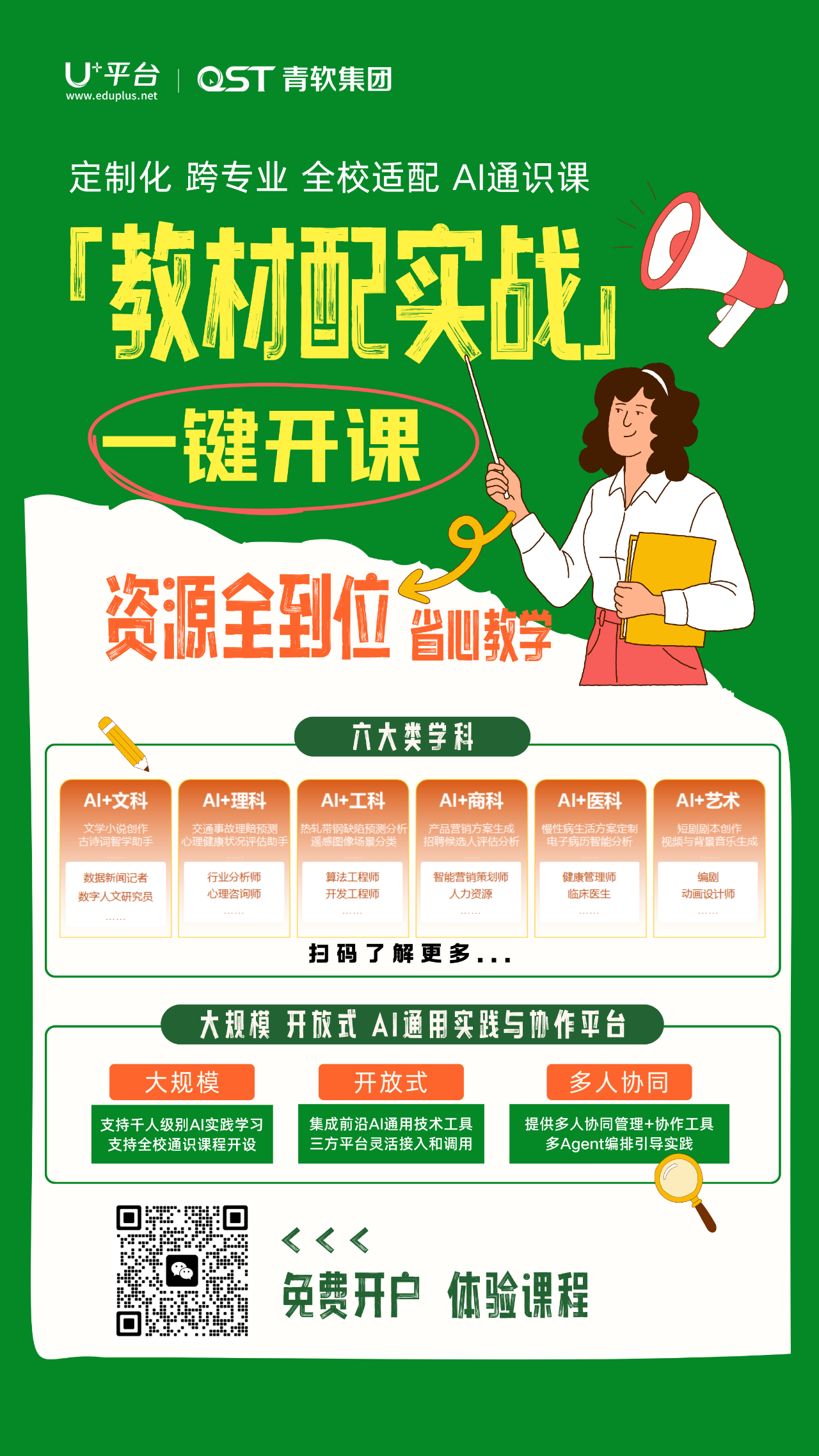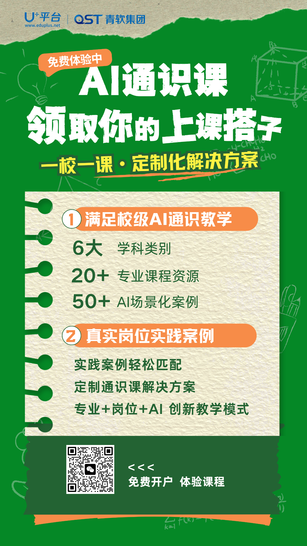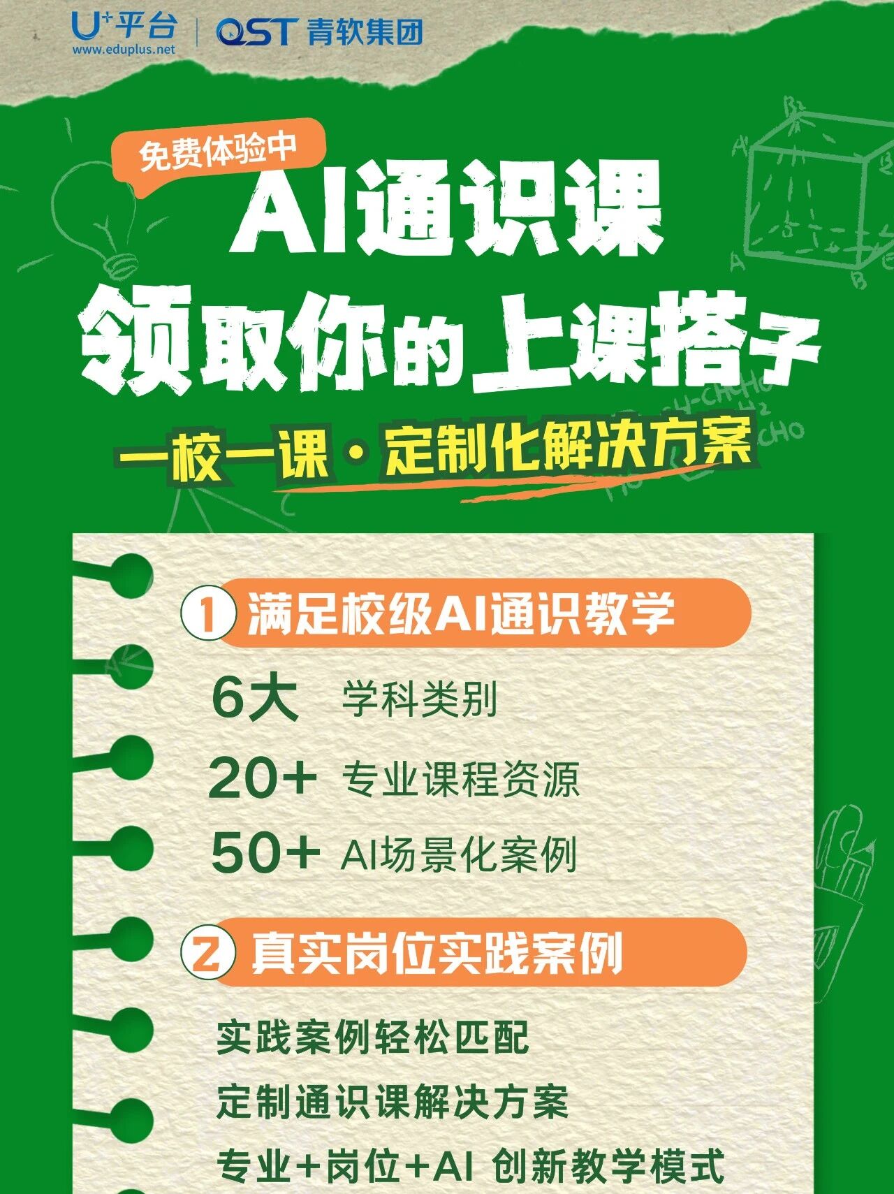 想开展AI通识课,却找不到适配方案?青软集团定制化AI通识课已就位,免费体验通道开启~<br><br>[加油]不管您用什么教材、开什么课程,都能精准匹配实战资源,6大类学科全适配!搭配支持千人学习、工具灵活调用的大规模开放式协作平台,AI通识教学开展超省心~<br><br>[鼓掌]「一校一课」精准对接教学需求,20+专业资源,,涵盖6大学科50+场景案例全涵盖,真实岗位案例匹配,「专业+岗位+AI」模式打通学用壁垒。 <br><br>[得意]「用AI教AI」创新教学,100+AI工具、30+可视化算法辅助,让AI教学更直观、更高效。<br><br>扫码免费开户,体验青软定制方案~