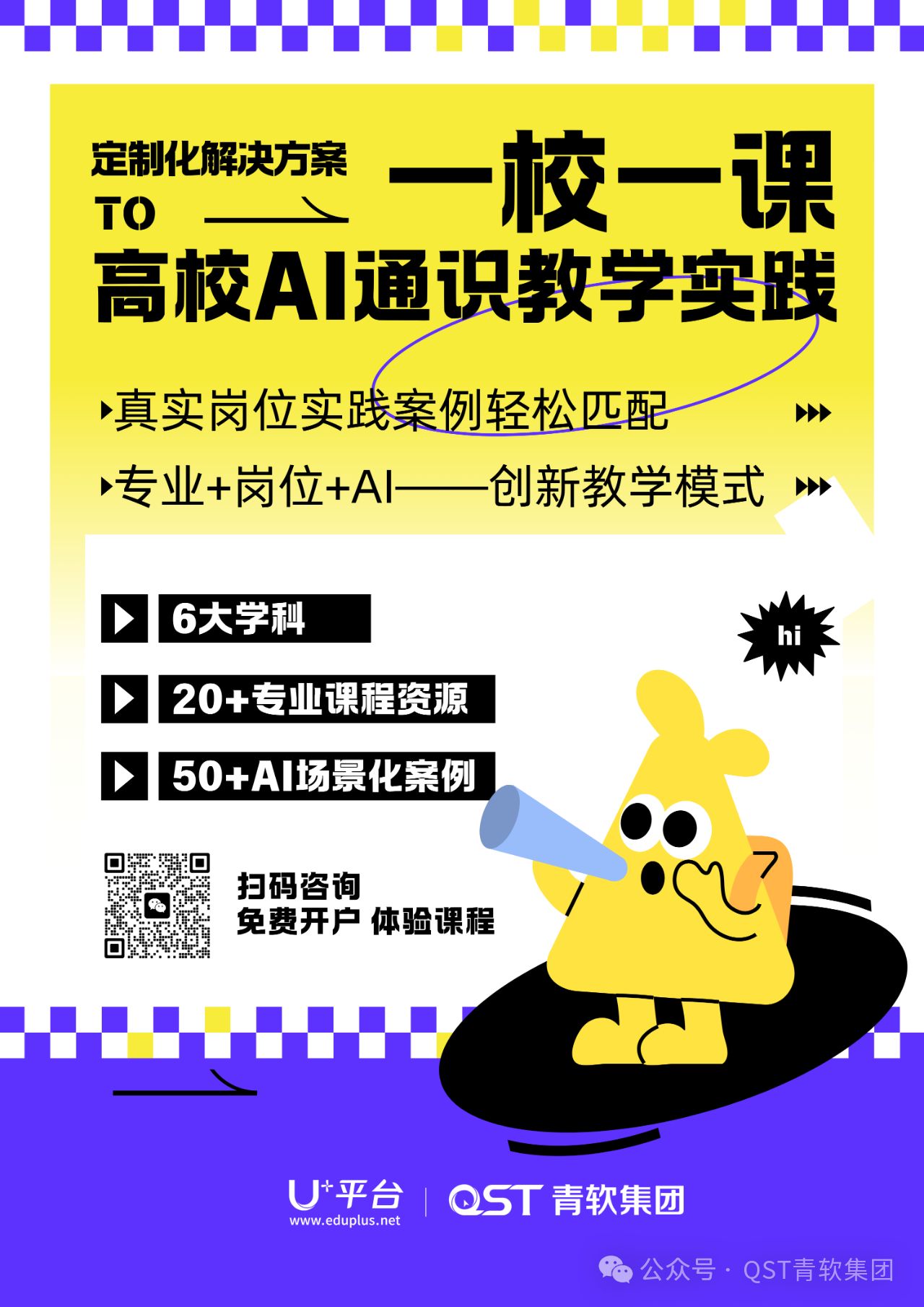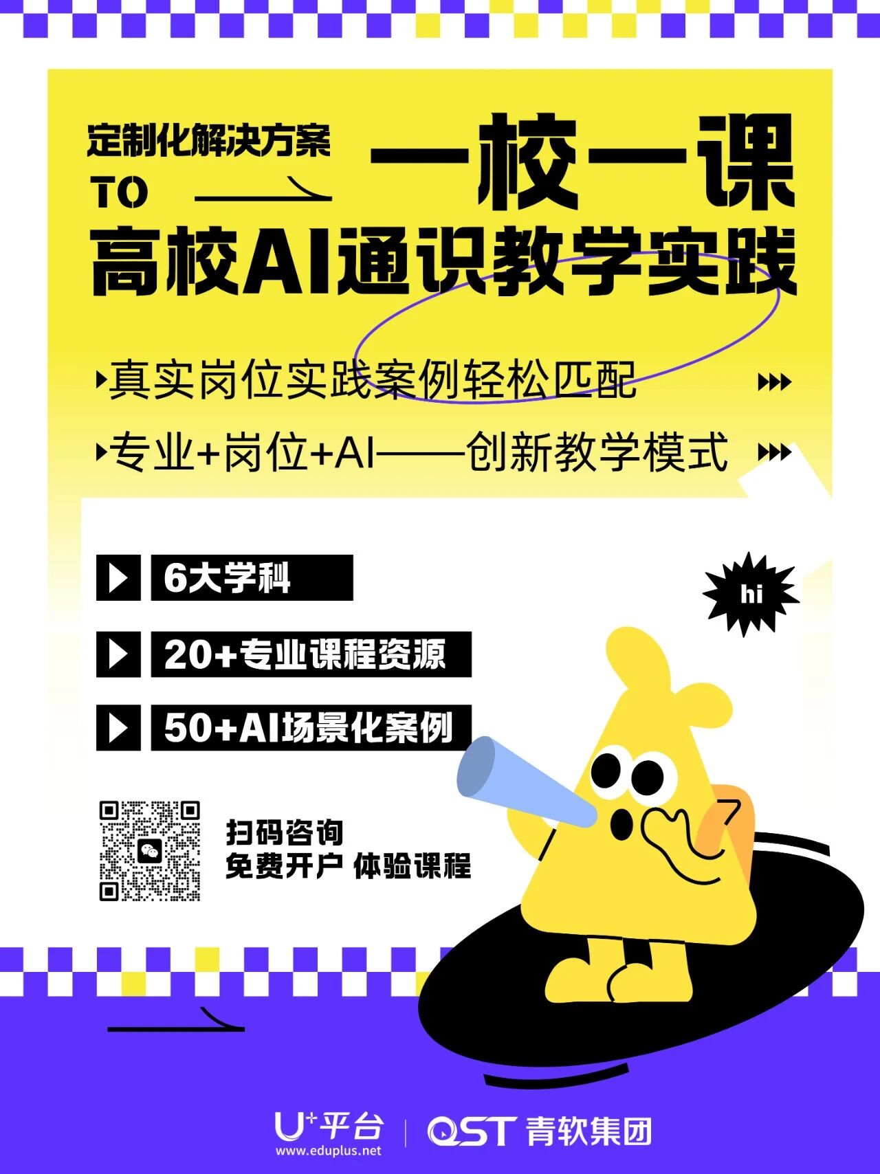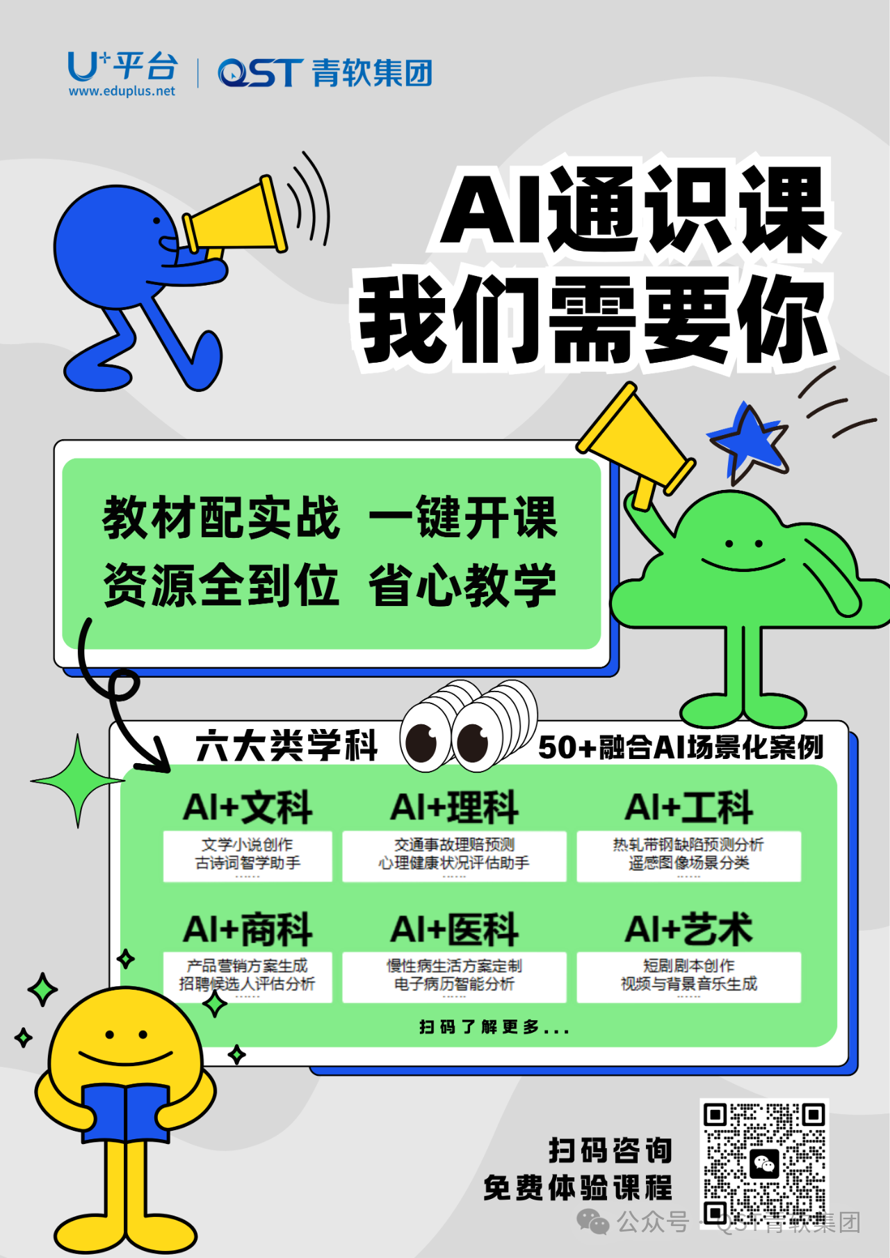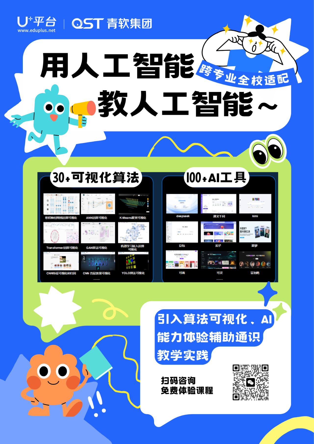 ✅ 真实岗位实践案例,轻松匹配教学需求<br>覆盖6大学科、20+专业课程资源、50+AI场景化案例,将真实岗位需求融入课堂,实现「专业+岗位+AI」三维融合的创新教学模式。x26lt;a class=x26quot;wx_topic_linkx26quot; topic-id=x26quot;x26quot; style=x26quot;color: #576B95 !important;x26quot; data-topic=x26quot;1x26quot;x26gt;<br>x26lt;/ax26gt;<br>✅ 可视化算法+AI工具辅助教学<br>平台集成30+可视化算法、集成100+无/低代码AI工具链,算法可视化、大语言模型生成、小模型开发多维度任你选,让抽象算法「看得见、摸得着」,降低教学门槛。<br><br>✅ 跨学科案例全覆盖<br>文科:文学小说创作、古诗词智学助手<br>理科:事故理赔预测、心理诊断报告生成<br>工科:环境数据监测、工业宣传片生成<br>医科:门诊病历生成、电子病历分析<br>……<br>紧密对接不同专业背景学生的兴趣与需求。<br><br>✅ 立足校本教材,注入前沿案例<br>依托高校原有教材制定课程大纲,提供丰富的行业实战案例、实践平台及AI工具等,助您轻松构建高质量AI通识课堂。x26lt;a class=x26quot;wx_topic_linkx26quot; topic-id=x26quot;mfxqgd9u-q84ugkx26quot; style=x26quot;color: #576B95 !important;x26quot; data-topic=x26quot;1x26quot;x26gt;#AI通识课x26lt;/ax26gt; x26lt;a class=x26quot;wx_topic_linkx26quot; topic-id=x26quot;mfxqgnj4-blzhqwx26quot; style=x26quot;color: #576B95 !important;x26quot; data-topic=x26quot;1x26quot;x26gt;#AI通识教学实践x26lt;/ax26gt;