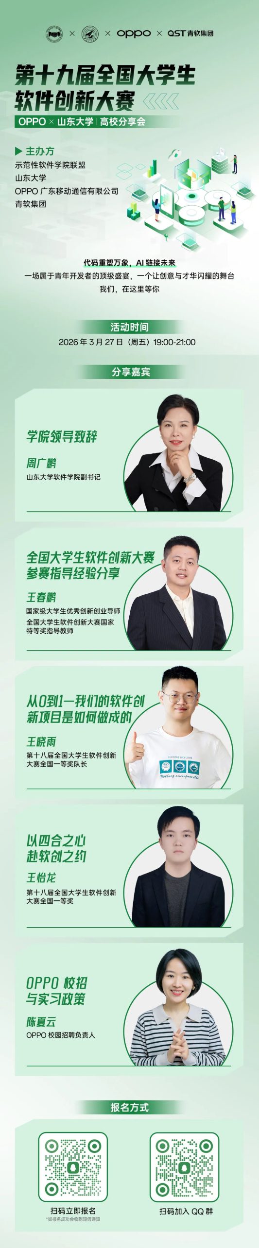 直播预告 | 3月27日锁定!软件创新大赛山东大学分享会:国一学长亲授秘籍,惊喜好礼送不停 / 新闻资讯 / 作者: Ellen 点击预约,锁定精彩 ✦ 往期回顾 ✦ 6小时掌握AI全栈实操 | 青软OPC实训基地首期实战课收官,以实用技能赋能职创发展 因聚而升 融智有为|青软集团亮相华为伙伴大会 联合发布行业+AI推理一体机解决方案 以培强师|青软集团助力内蒙古工业大学 打造「能教善研」的AI师资队伍 本周末培训!青软集团OPC实训基地AI实战课火热报名中 本篇文章来源于微信公众号: QST青软集团