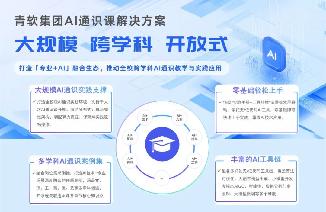 当AI从「技术热点」沉淀为智能时代的「基础素养」,青软集团AI通识课解决方案,正成为高校培养「懂AI逻辑、能用AI实践、能适配岗位」跨学科复合型人才的「加速器」——让每一位学生不仅能明晰AI技术脉络,更能借AI工具赋能专业学习、提前掌握产业所需技能。