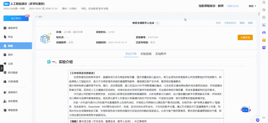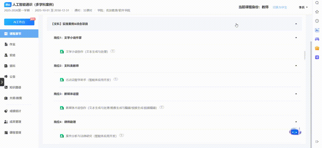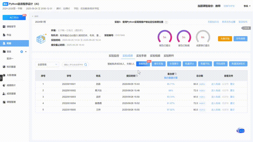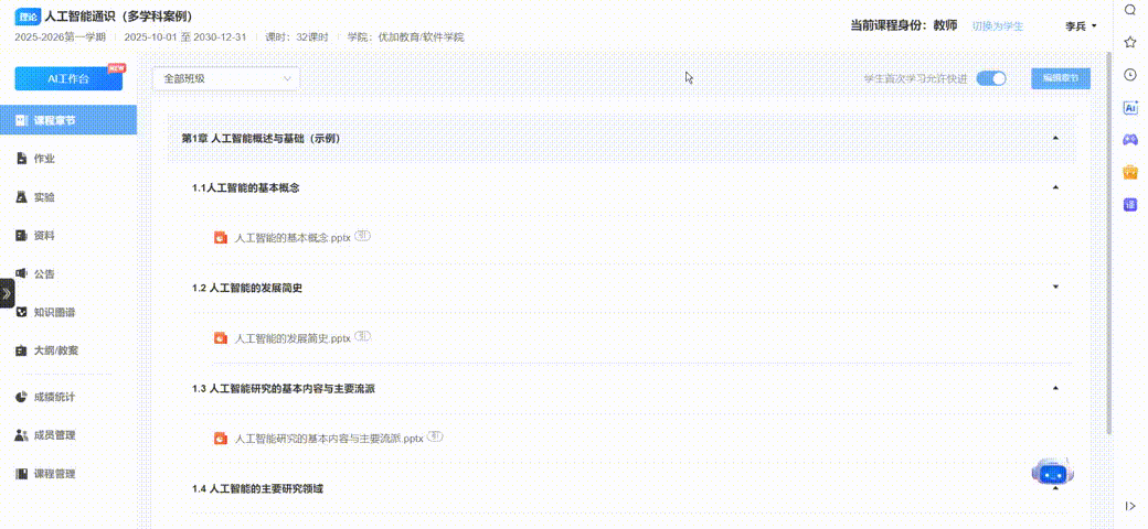 涵盖课程管理、课件分发、多题型作业自动评判、实验在线批阅、成绩分析等功能,教师可批量处理教学任务,减少重复性工作;支持课堂讨论、跨课程资源引用,逐步构建AI通识学习生态,让教学更高效、更精准。