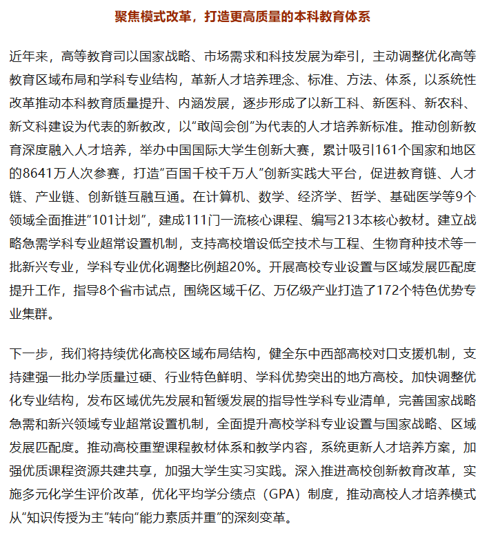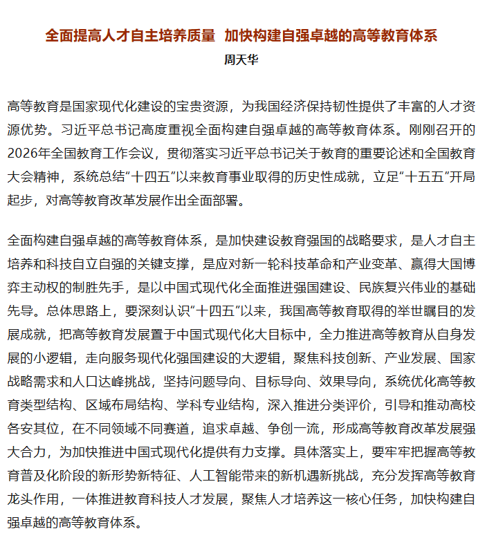 教育部高等教育司司长周天华:全面提高人才自主培养质量 加快构建自强卓越的高等教育体系 / 新闻资讯, 青软观点 / 作者: Ellen 以下文章转载自中国高等教育,作者周天华。 ✦ 往期回顾 ✦ 157项成果见证校企协同力量,青软集团携手20余所高校交出2025亮眼答卷 青软集团、海克斯康、斯坦德共签「助企发展工作组」协议,深化青岛高新工匠学院产教协同机制 青软集团入选工信部首批「鸿蒙人才发展促进工作组」成员单位 台湾大学李宏毅《机器学习》精品课程上线青软U+平台,面向全国高校开放教学共享 本篇文章来源于微信公众号: QST青软集团