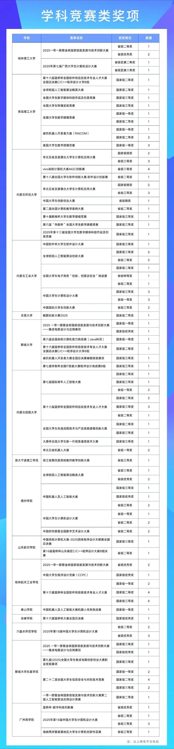 以赛促学、以赛促练。青软集团与合作高校联合组织学生参与各类国家级、省级信息技术类竞赛,覆盖人工智能、机器人、计算机设计、数学建模等多个领域,斩获百余项国家级、省级奖项,检验育人成效,形成「以赛育人、以赛促教」的良性循环。